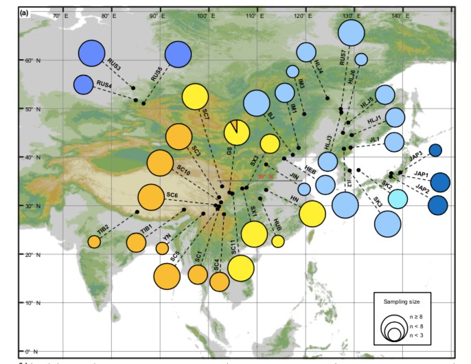 對(duì)包括地理距離、環(huán)境、氣候歷史和外部傳播在內(nèi)的潛在驅(qū)動(dòng)因素分析發(fā)現(xiàn),該復(fù)合群以東亞35°N(即秦-巴山脈以北)為分界線,南北群體在遺傳、形態(tài)和生態(tài)水平上存在明顯差異。群體歷史動(dòng)態(tài)和分布區(qū)模擬分析表明,由于第四紀(jì)氣候的變化,導(dǎo)致了該類群能夠從亞洲東北部向西南部遷移并定居于新的生境。此外,除了生態(tài)適應(yīng)性外,該研究還發(fā)現(xiàn)林冠郁閉度、風(fēng)向以及生境連續(xù)性都可能限制基因流的影響。這些結(jié)果為蕨類植物時(shí)空演化模式的研究提供了新的思路,強(qiáng)調(diào)了生境異質(zhì)性在驅(qū)動(dòng)遺傳分化對(duì)強(qiáng)擴(kuò)散能力的影響。