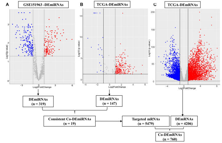 ?通過TCGA數(shù)據(jù)庫和測序數(shù)據(jù)分別得到差異表達(dá)的miRNAs和mRNA。然后,通過兩個數(shù)據(jù)集之間的交叉分析,獲得共同差異表達(dá)miRNA。再通過靶向的mRNA和TCGA中的差異mRNA的重疊確定共有差異mRNA。利用cytoscape構(gòu)建了miRNA-mRNA調(diào)控網(wǎng)絡(luò)。前5個miRNA在網(wǎng)絡(luò)中被確定為樞紐miRNA。通過GO分析和KEGG通路分析,揭示了與樞紐miRNA靶向基因相關(guān)的功能和信號通路。利用STRING數(shù)據(jù)庫和CytoHubba對蛋白相互作用(PPI)網(wǎng)絡(luò)中的關(guān)鍵mRNA進(jìn)行了鑒定。使用基因表達(dá)譜交互分析(GEPIA)進(jìn)行生存分析。