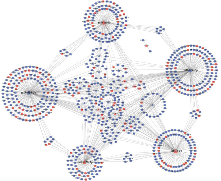 (圖5)關(guān)鍵miRNAs靶向mRNA的PPI網(wǎng)絡(luò)圖