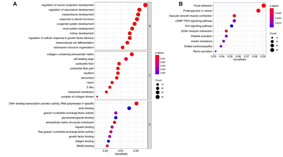作者使用了677個共有差異mRNAs,通過GO和KEGG通路富集分析來鑒定關(guān)鍵miRNAs的潛在功能。作者在GO分析中獲得了836個結(jié)果,其中圖4A顯示了來自生物過程、細(xì)胞成分和分子功能的前10個結(jié)果。一些結(jié)果與腫瘤的發(fā)生和進(jìn)展有關(guān),包括調(diào)節(jié)細(xì)胞對生長因子刺激的反應(yīng),含膠原蛋白的細(xì)胞外基質(zhì)和基底膜等。此外,從KEGG通路分析中注釋了48條信號通路,前10個結(jié)果如圖4B所示。這些通路大多數(shù)與腫瘤的發(fā)生和發(fā)展相關(guān),包括焦點粘連、癌癥中的蛋白多糖、細(xì)胞外基質(zhì)-受體相互作用和Wnt信號通路。其中粘著斑通路富集最為顯著。