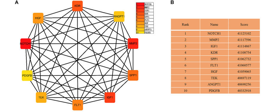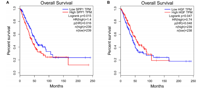 PPI網(wǎng)絡(luò)從677個共有差異mRNA中識別出597個mRNA,其中有2246條邊相互關(guān)聯(lián)(圖5)。使用cytoHubba插件MCC排名確定了前10個關(guān)鍵mRNA,包括神經(jīng)源性位點notch同源蛋白1(NOTCH1)、基質(zhì)金屬蛋白酶2(MMP2)、胰島素樣生長因子1(IGF1)、激酶插入結(jié)構(gòu)域受體(KDR)、分泌磷蛋白1(SPP1)、血管內(nèi)皮生長因子受體1(FLT1)、肝細(xì)胞生長因子(HGF)、血管生成素1受體(TEK),血管生成素-1基因(ANGPT1)和血小板源性生長因子(圖6)。通過生存分析的計算,作者使用GEPIA進(jìn)一步驗證了這些關(guān)鍵的mRNA。在這里,只有兩個(SPP1和HGF)被鑒定為關(guān)鍵基因,并與生存相關(guān)(圖7)。生存分析顯示,在LUAD中,SPP1的表達(dá)與生存呈負(fù)相關(guān),而HGF與生存呈正相關(guān)(圖7)。此外,SPP1和HGF均在黏附信號通路中富集。