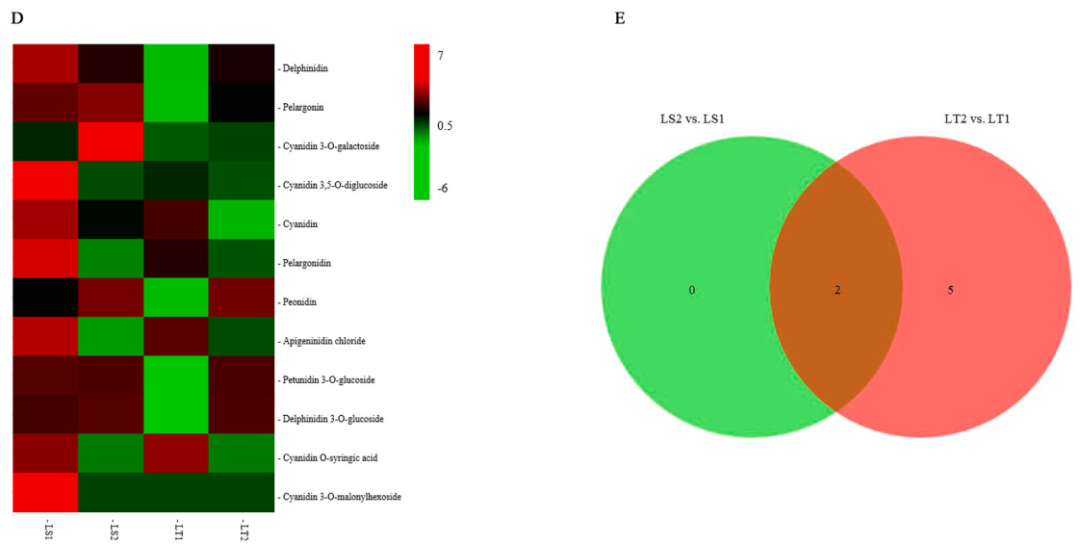 為了進(jìn)一步檢測花青素的類型,將花青素與代謝物數(shù)據(jù)庫進(jìn)行比較。其中兩種花青素,即花青素O-丁香酸和芹菜苷氯化物,在葉芽中表現(xiàn)出較高的含量,其他花青素在葉片發(fā)育期間保持在穩(wěn)定水平(圖4D)。從“Tailihong”的葉片中鑒定出11種花青素。其中三種花青素,即芹菜苷氯化物、花青素和花青素O-丁香酸隨著成熟過程而減少。相反,四種花青素,即飛燕草素3-O-葡萄糖苷、天竺葵素、牡丹素和矮牽牛素3-O-葡萄糖苷,隨著葉片發(fā)育而增加(圖4D)。多重比較表明,氰基鄰丁香酸和芹菜素氯化物在兩個(gè)紫葉品種的葉芽著色中起著關(guān)鍵作用(圖4E)