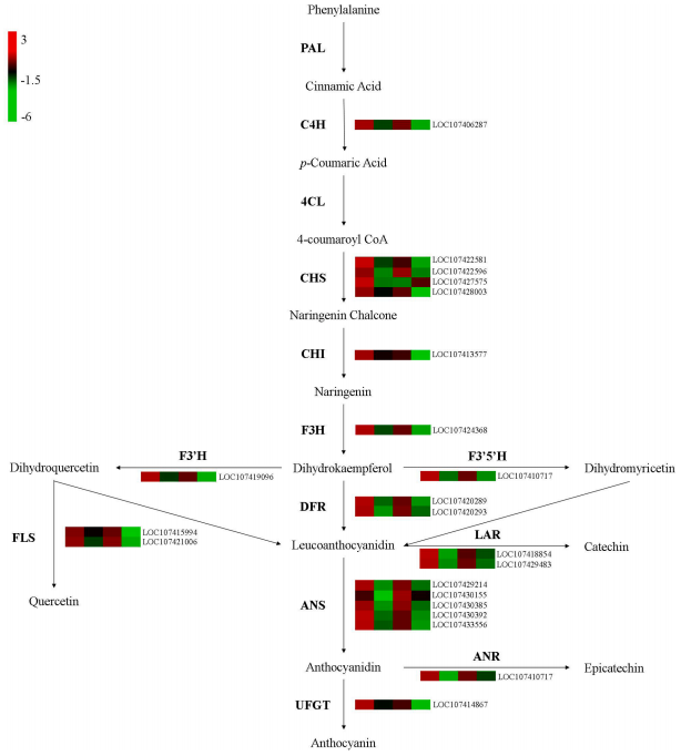 根據(jù)代謝組學(xué)分析結(jié)果,黃酮類化合物是棗葉中的主要代謝產(chǎn)物,并決定了棗葉的顏色。在“Sanbianhong”中,在LS1和LS2之間檢測到20個(gè)差異表達(dá)的類黃酮結(jié)構(gòu)基因,并且所有基因都隨著葉片發(fā)育而減少(圖5)。同樣,在成熟過程中,“Tailihong”中19個(gè)類黃酮結(jié)構(gòu)基因的表達(dá)大幅下降(圖5)。此外,“Sanbianhong”中差異表達(dá)的類黃酮結(jié)構(gòu)基因大部分與“Tailihong”中的DEGs重疊,包括一個(gè)C4H基因、兩個(gè)CHS基因、一個(gè)CHI基因、一個(gè)F3H基因、一個(gè)F3′H基因、一個(gè)F3′5′H基因、一個(gè)FLS基因、兩個(gè)DFR基因、兩個(gè)LAR基因、四個(gè)ANS基因和一個(gè)UFGT基因。