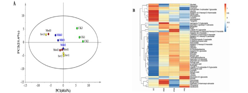 Fig. 3 對(duì)不同程度油斑病的青檸皮次級(jí)代謝產(chǎn)物和三種初級(jí)代謝產(chǎn)物(酪氨酸、亮氨酸和苯丙氨酸)進(jìn)行主成分分析(A)和層次聚類分析(B)