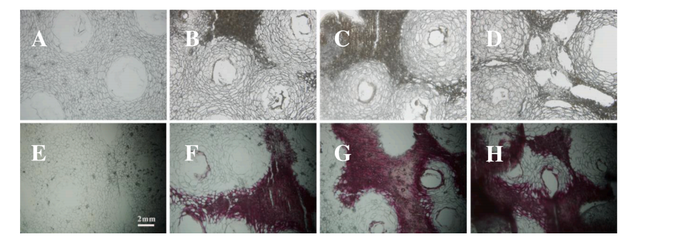 為了從形態(tài)學(xué)角度揭示油斑病對(duì)檸檬皮中木質(zhì)素積累的影響,采用間苯三酚-鹽酸反應(yīng)對(duì)健康和油斑病檸檬皮的橫截面進(jìn)行了木質(zhì)素化研究。在染色前,健康檸檬皮的細(xì)胞排列整齊,沒(méi)有塌陷,而輕度油斑病檸檬皮的細(xì)胞似乎塌陷并堆積在一起。隨著油斑病嚴(yán)重程度的增加,細(xì)胞的堆積越來(lái)越明顯,細(xì)胞間組織的塌陷導(dǎo)致不同程度的破裂,特別是在油斑病嚴(yán)重的檸檬皮中,可以觀察到許多裂痕洞(Fig. 4)。