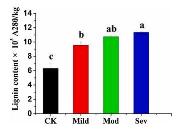 為進(jìn)一步證實(shí)油斑病對(duì)檸檬皮中木質(zhì)素積累的影響,測(cè)定了不同油斑病程度檸檬皮中木質(zhì)素含量。結(jié)果表明,油斑菌病顯著提高了木質(zhì)素含量,且呈程度依賴性。中度油斑病檸檬皮與輕度和重度油斑病的檸檬皮的木質(zhì)素含量無(wú)顯著差異。與對(duì)照組相比,輕度、中度和重度油斑病的檸檬皮中總木質(zhì)素含量分別顯著增加了51.2%、69.7%和79.6%(Fig. 5),這與染色結(jié)果一致。