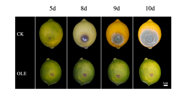 檸檬皮在油斑病中積累了大量的抗性物質(zhì)。為了進(jìn)一步說(shuō)明油斑病對(duì)果實(shí)抗性的影響,對(duì)健康和油斑病受損的檸檬皮為例進(jìn)行了接種。結(jié)果表明,接種5 d后,健康檸檬皮接種部位周圍有小病變區(qū),青霉孢子較多,有水漬圈,油斑病受損檸檬皮接種部位也有小病變區(qū),但沒(méi)有水漬圈(Fig. 8)。8 d后,健康檸檬皮的病變面積和水漬圈明顯擴(kuò)大,而油斑病受損的檸檬皮病變面積和水漬圈沒(méi)有明顯變化。接種后9 ~ 10 d,病變面積和水漬圈不斷增大;結(jié)果,果實(shí)軟化腐爛。但油斑病仍表現(xiàn)出較高的硬度,病變面積沒(méi)有擴(kuò)大,青霉孢子的粘附和生長(zhǎng)受到明顯抑制。