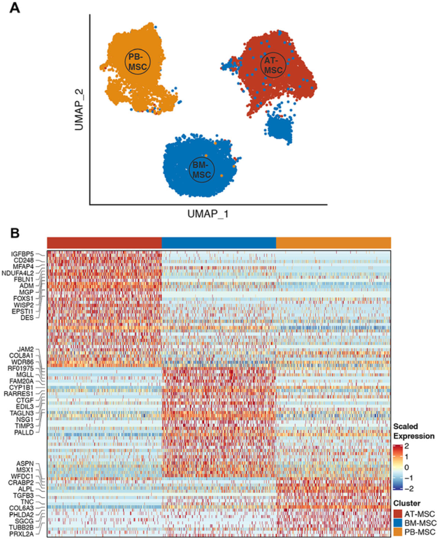 美國康奈爾大學(xué)獸醫(yī)學(xué)院貝克動(dòng)物健康研究所Van?de?Walle研究團(tuán)隊(duì)于2020年12月4日在Stem?Cell?Research?&?Therapy上發(fā)表了解析MSC異質(zhì)性的研究進(jìn)展。文章利用了scRNA-seq等技術(shù)探索三個(gè)不同組織來源(AT、BM、PB)的原代馬間充質(zhì)基質(zhì)細(xì)胞的源間和源內(nèi)異質(zhì)性,并確定了檢測(cè)到的轉(zhuǎn)錄差異與細(xì)胞運(yùn)動(dòng)和免疫調(diào)節(jié)功能的表型變異相對(duì)應(yīng),這將提高M(jìn)SC?治療潛力,加速其從實(shí)驗(yàn)室到臨床的過渡。