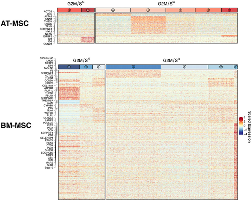 無監(jiān)督聚類分別將AT來源的MSCs、BM來源的MSCs和PBM來源的MSCs聚類為7,7,10個(gè)clusters(Fig.?4a)。根據(jù)作者最初的分析中,細(xì)胞周期相關(guān)基因的表達(dá)對(duì)聚類有很大的影響(Kowalczyk?et?al.,?2015)。在本研究中作者也觀察到一些明顯由與增殖一致的基因表達(dá)模式定義的簇(Fig.?4b),因此,作者進(jìn)一步分析了G1?clusters和G2M/S?clusters,以確定不同細(xì)胞周期分類的簇間差異基因表達(dá)模式。在這種分組策略下,差異基因表達(dá)測(cè)試顯示來自AT、BM和PB衍生的MSCs中存在明顯的源內(nèi)轉(zhuǎn)錄異質(zhì)性,盡管在AT來源的MSCs中差異較小,差異表達(dá)基因?(DEGs)?以熱圖的形式進(jìn)行展示?(Fig.?5)。為了檢查檢測(cè)到的clusters的假定生物學(xué)功能,作者對(duì)每個(gè)組織中的每個(gè)cluster進(jìn)行了GO功能富集分析,其中BM來源的MSCs中排名最靠前的是cluster2的細(xì)胞遷移和cluster3中的慢性炎癥反應(yīng),PB來源的MSCs中排名靠前的是cluster4的蛋白組折疊和cluster6中的趨化性調(diào)節(jié),AT來源的MSCs沒有檢測(cè)到任何顯著富集的GO?terms,表明檢測(cè)到的clusters之間的轉(zhuǎn)錄差異極小。