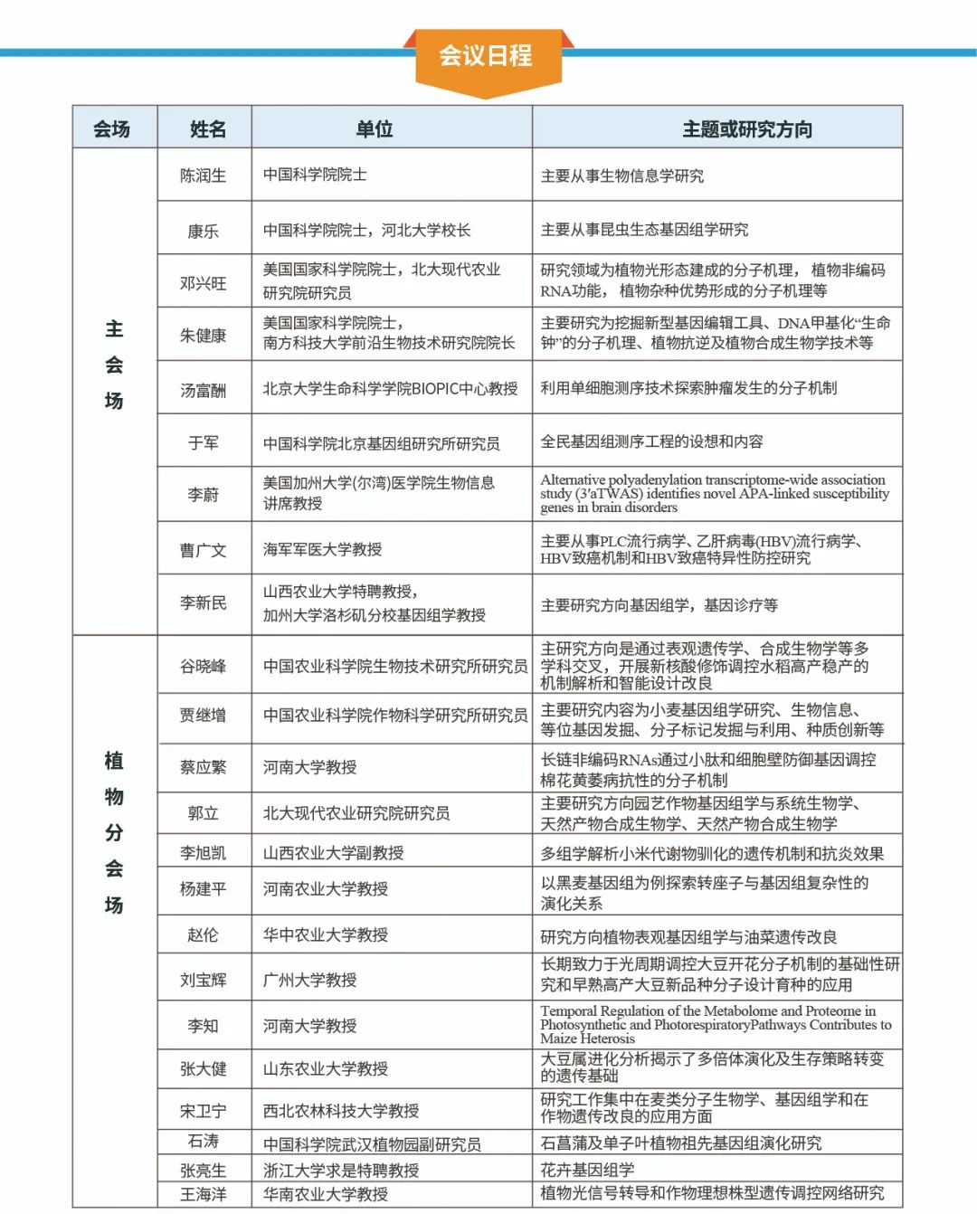 隨著基因組組裝(GA)、種質(zhì)資源鑒定(GC)、基因功能鑒定(GI)、基因組育種(GB)、基因編輯(GE)的5G育種策略快速發(fā)展,以高通量測序技術為基礎的組學研究已經(jīng)廣泛應用于植物研究的各個領域。本次大會特邀植物功能基因組學、系統(tǒng)與進化植物學、表觀遺傳學等熱點領域?qū)<引R聚一堂,分享植物研究的前沿技術、經(jīng)驗成果及發(fā)展前景。