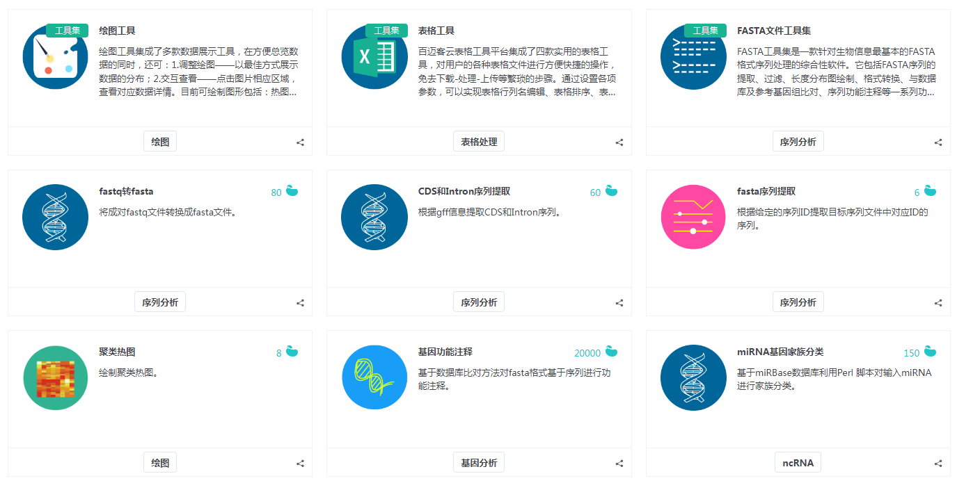 文獻(xiàn)里面好看又直觀的的美圖是如何制作出來(lái)噠?比如韋恩圖、箱形圖等。這就需要用到一些畫圖工具,這里推薦百邁客云在線分析工具,百邁客云有104款分析小工具,涵蓋基因分析、遺傳進(jìn)化、ncRNA、質(zhì)控、組裝、比對(duì)、數(shù)據(jù)提取、突變、統(tǒng)計(jì)、表格處理、繪圖、序列分析等12大功能,非常齊全。