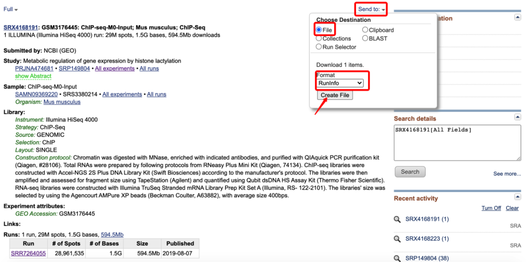 這里面包含了這個(gè)樣本的基本信息,包括測(cè)序平臺(tái)、文庫(kù)類型、數(shù)據(jù)量等基本信息,然后點(diǎn)擊頁(yè)面右上方的Send to按鈕,選擇File,F(xiàn)ormat選擇RunInfo,然后點(diǎn)擊Creat file下載一個(gè)csv文件,打開(kāi)文件,可以看到一個(gè)下載鏈接