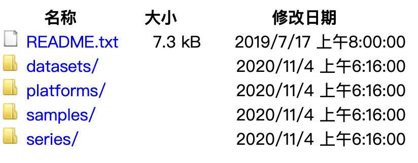 d)?GEO Dataset (GDS) 數(shù)據(jù)集的ID號(hào)這些數(shù)據(jù)均可以在ftp(ftp://ftp-trace.ncbi.nih.gov/geo/)進(jìn)行下載。