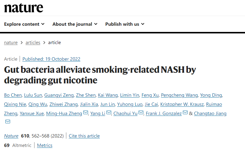 2022年10月19日,北京大學醫(yī)學部姜長濤團隊聯(lián)合美國國立衛(wèi)生研究院、浙江大學醫(yī)學院、復旦大學基礎醫(yī)學院和溫州醫(yī)科大學的研究團隊在國際期刊《Nature》雜志在線發(fā)表了題為“Gut bacteria alleviate smoking-related NASH by degrading gut nicotine”的重磅研究。該研究解析了腸道尼古丁積累在非酒精性脂肪性肝炎進展中的作用,發(fā)現(xiàn)了人類腸道中一種能夠代謝尼古丁的內(nèi)源性細菌,并提出了一種可能的減少吸煙加劇NAFLD進展的途徑。百邁客為該研究提供了宏基因組測序服務。