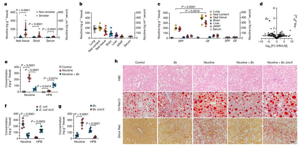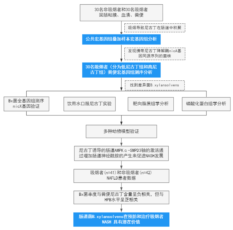 該研究發(fā)現(xiàn)尼古丁在吸煙期間在腸道中積聚并加速NAFLD的進展,但它可以被人類共生菌B. xylanisolvens 有效降解。揭示了了腸道尼古丁積累的病理影響,并確定了一種內(nèi)源性尼古丁降解腸道細菌,該細菌對預防和治療吸煙者的 NASH 具有潛在價值。