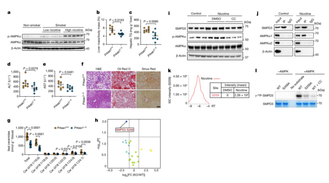 總之,尼古丁誘導的腸道AMPKα-SMPD3軸的激活通過增加腸道神經(jīng)酰胺的產(chǎn)生來促進非酒精性脂肪肝的進展,因此抑制SMPD3是一種潛在的緩解肝臟脂肪變性、炎癥和纖維化的策略。