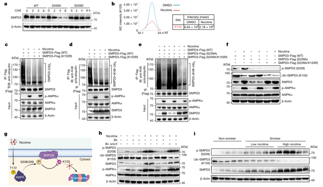 此外,在尼古丁處理的SW480細胞中,SMPD3在Lys103處的去泛素化程度顯著高于DMSO處理的細胞(圖3B和擴展數(shù)據(jù)圖6G)。通過免疫沉淀,我們發(fā)現(xiàn)泛素化的SMPD3(Lys103)主要包含經(jīng)典的Lys48-連接Ub鏈(Lys48-Ub),而不是Lys63-Ub,后者被尼古丁處理減少(圖3C,d和擴展數(shù)據(jù)圖6h)。S209A突變逆轉了尼古丁誘導的SMPD3 Lys48-Ub的減少,K103R突變進一步緩解了這一下降(圖3e和擴展數(shù)據(jù)圖6i)。此外,開發(fā)了抗p-SPMD3(S209)和抗Ub-SMPD3(Lys103)抗體(擴展數(shù)據(jù)圖6J,k),并證實尼古丁誘導的總SMPD3蛋白的增加是由于SMPD3磷酸化水平升高,隨后泛素化減少(圖3F)。