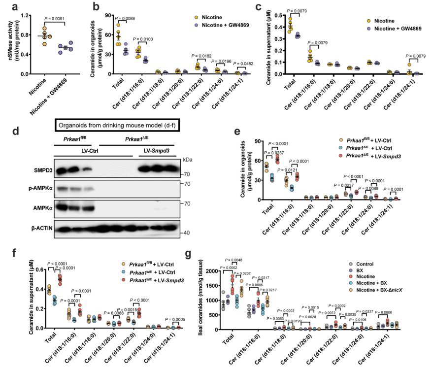 SMPD3被認為是代謝性疾病的病理加速器。將SMPD3抑制劑GW4869應用于有機化合物以抑制SMPD3活性。GW4869降低了尼古丁處理下類器官及其上清液中的神經(jīng)酰胺水平。慢病毒表達的SMPD3被用于從尼古丁飲用模型恢復Prkaa1基因敲除的回腸器官中SMPD3的表達。正如預期的那樣,SMPD3的過表達逆轉了由于回腸器官中AMPKα1缺乏而導致的神經(jīng)酰胺水平的降低。在尼古丁加速的NASH小鼠模型中,在B. xylanisolvens存在的情況下,被B.xylansolvens定植的SPF小鼠回腸神經(jīng)酰胺減少,這是由于腸道p-AMPKα-SMPD3軸被抑制所致。