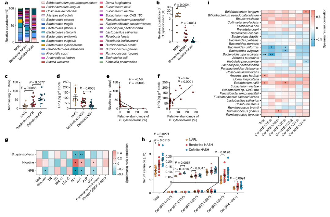 為了闡明我們的發(fā)現(xiàn)與人類NAFLD進展之間的相關性,我們收集了83名經(jīng)活檢證實的NAFLD患者的數(shù)據(jù),這些患者被分為吸煙者(n=41)和非吸煙者(n=42)。在吸煙者中,NAFL、Borderline NASH和Defined NASH在煙草吸煙史(包括吸煙年限和每天吸煙數(shù)量)方面沒有顯著差異。然而,我們發(fā)現(xiàn)B.xylansolvens水平與NAFLD嚴重程度呈負相關,隨著NAFLD的進展,糞便中尼古丁水平逐漸增加,糞便中尼古丁降解產(chǎn)物HPB相應地隨著NAFLD的進展而減少(圖4C,d)。在吸煙者中,B.xylansolvens豐度與糞便尼古丁含量呈負相關,但與HPB水平呈正相關(圖4e,f)。