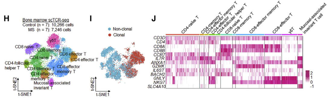樣本設(shè)計(jì):MS患者及健康對(duì)照各7例,取骨髓樣本,進(jìn)行scRNA-seq+scTCR-seq。