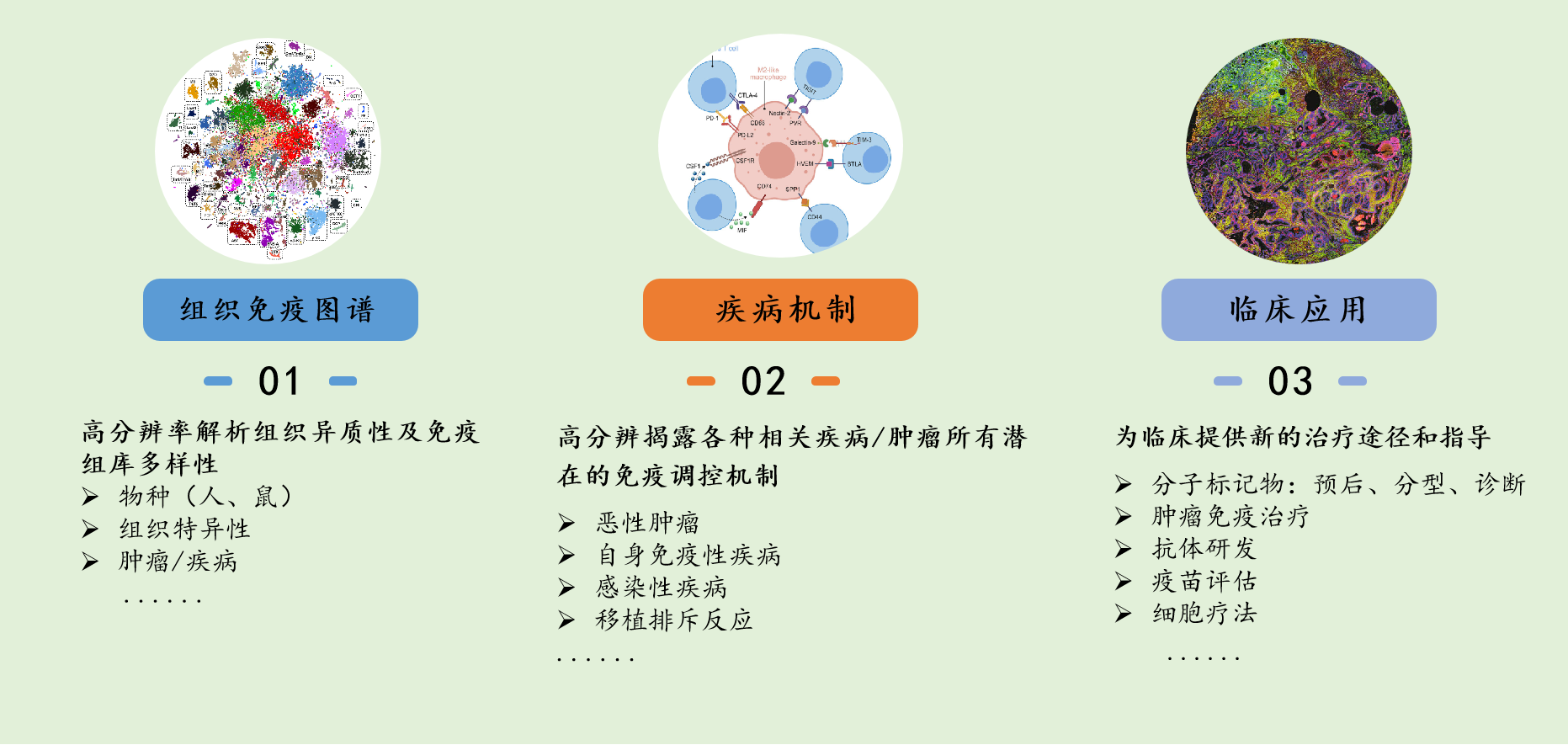2)利用單細(xì)胞免疫組庫(kù)技術(shù),理解腫瘤與免疫的相互作用,尋找惡性腫瘤免疫治療的潛在靶點(diǎn);揭示移植體抗宿主病背后的生物學(xué)機(jī)制,為免疫調(diào)節(jié)治療提供潛在方向;破譯錯(cuò)誤導(dǎo)向免疫應(yīng)答的機(jī)制,解析免疫耐受機(jī)制與免疫應(yīng)答動(dòng)態(tài)調(diào)節(jié)之間的復(fù)雜相互作用;