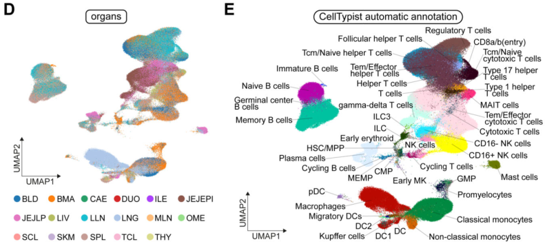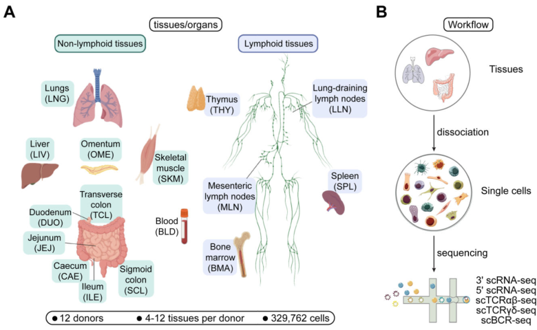 樣本設(shè)計(jì):2個(gè)成人捐獻(xiàn)者的16份組織樣本,分別進(jìn)行scRNA、scTCR、scBCR,實(shí)驗(yàn)中采集的組織樣本包括初級(jí)淋巴器官(骨髓)和次級(jí)淋巴器官(脾、肺引流和腸系膜淋巴結(jié))、粘膜組織(腸和肺)以及血液和肝臟等非淋巴組織,還包括胸腺、骨骼肌和網(wǎng)膜。