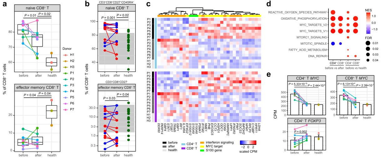 研究?jī)?nèi)容:川崎?。↘D)是一種急性全身性發(fā)熱性疾病和兒童期血管炎,可導(dǎo)致冠狀動(dòng)脈病變,已成為許多發(fā)達(dá)國(guó)家兒童獲得性心臟病的常見原因。盡管已經(jīng)報(bào)道了免疫細(xì)胞的功能和表型變化,但對(duì)急性KD全局免疫反應(yīng)的理解尚不清楚。本研究通過(guò)對(duì)IVIG治療前后的KD患者PBMC樣本進(jìn)行單細(xì)胞免疫組庫(kù)測(cè)序,發(fā)現(xiàn)了CD8+T細(xì)胞在治療后的特異性克隆擴(kuò)增,提示是常規(guī)抗原而非超抗原可能是KD發(fā)病機(jī)制的原因,CD8+T相關(guān)細(xì)胞的比例是川崎病的重要風(fēng)險(xiǎn)因素;研究繪制了川崎病外周血單細(xì)胞免疫圖譜,揭示了川崎病治療前后及對(duì)照中PBMC各類型免疫細(xì)胞比例、基因表達(dá)、免疫反應(yīng)、生物學(xué)功能以及細(xì)胞表面受體的變化。
