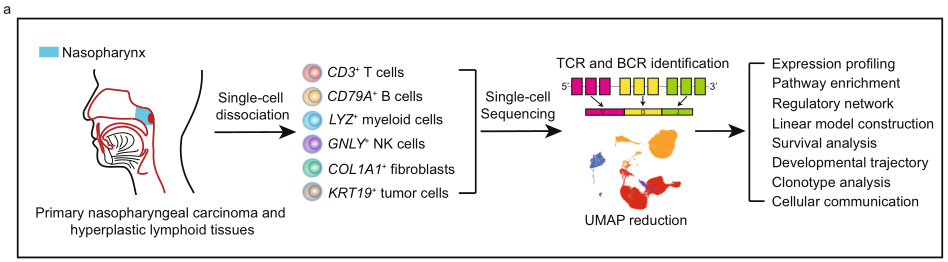 樣本設(shè)計(jì):11例鼻咽癌患者的腫瘤樣本和3例非惡性鼻咽淋巴增生的樣本,進(jìn)行scRNA+scTCR+scBCR測(cè)序。