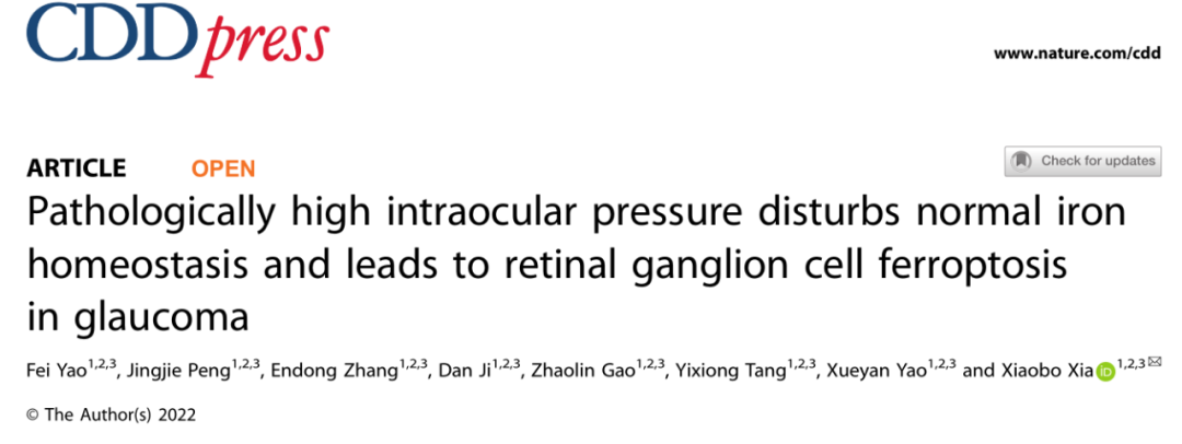 Yao F, Peng J, Zhang E, et al. Pathologically high intraocular pressure disturbs normal iron homeostasis and leads to retinal ganglion cell ferroptosis in glaucoma [published online ahead of print, 2022 Aug 6]. Cell Death Differ. 2022;10.1038/s41418-022-01046-4. doi:10.1038/s41418-022-01046-4