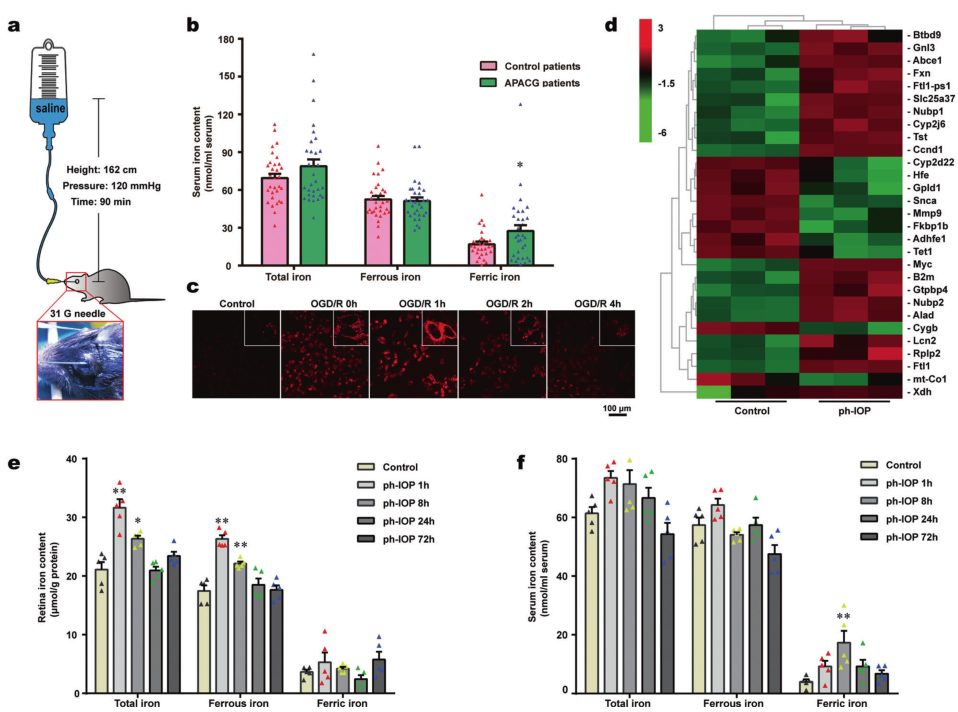 1. 通過分析急性原發(fā)性閉角型青光眼(APACG,Ph-IOP損傷最典型的一類青光眼)患者外周血清鐵離子含量發(fā)現(xiàn),青光眼患者血清中三價(jià)鐵離子含量較正常人群升高,推測(cè)鐵代謝可能參與調(diào)控了ph-IOP條件下RGC的損傷過程;