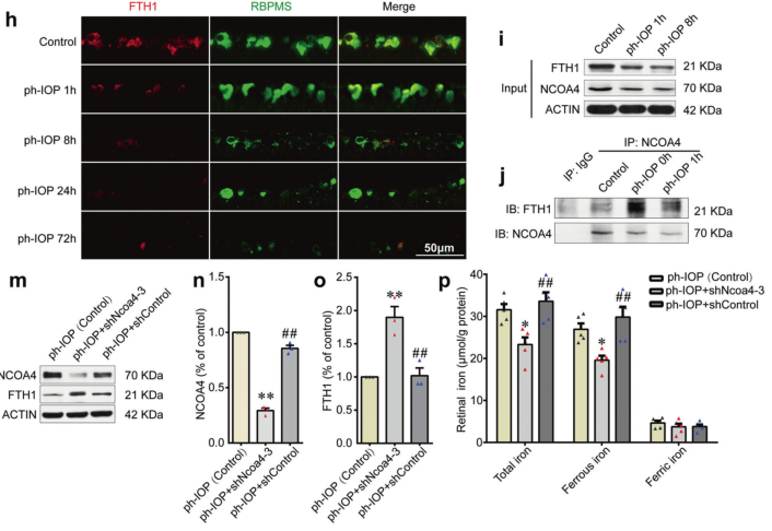 3. 進(jìn)一步研究發(fā)現(xiàn),核受體共激活劑4(NCOA4)介導(dǎo)的鐵蛋白重多肽1(FTH1)的降解是導(dǎo)致ph-IOP損傷后視網(wǎng)膜內(nèi)鐵代謝紊亂的重要原因,體內(nèi)敲低Ncoa4的表達(dá)可抑制FTH1的降解,并降低視網(wǎng)膜中二價(jià)鐵的水平;
