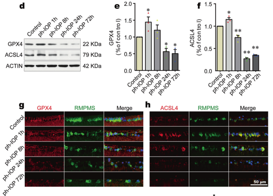 為了驗(yàn)證PH-IOP損失引起的視網(wǎng)膜鐵積累可能導(dǎo)致視網(wǎng)膜鐵死亡這一假設(shè),測(cè)量了氧化應(yīng)激相關(guān)生化指標(biāo),發(fā)現(xiàn)Ph-IOP損傷早期階段MDA含量顯著增加,而GSH和NADPH水平顯著降低;進(jìn)一步檢測(cè)鐵死亡核心標(biāo)志物GPX4(抑鐵死亡因子)和ACSL4(促鐵死亡因子)發(fā)現(xiàn),ph-IOP 損傷后24h,GPX4水平降低,在PH-IOP損傷后1h,ACSL4水平上調(diào)(圖3d-f);并且這些鐵死亡相關(guān)蛋白的變化主要集中在視網(wǎng)膜內(nèi)層,尤其是神經(jīng)節(jié)層(圖3g, h),提示鐵死亡誘導(dǎo)的細(xì)胞損傷可能集中在 RGC 中(位于視網(wǎng)膜最內(nèi)層);TEM檢測(cè)發(fā)現(xiàn)PH-IOP引起RGC線粒體收縮和線粒體膜密度增加,表明ph-IOP誘導(dǎo)的視網(wǎng)膜鐵累積導(dǎo)致視網(wǎng)膜鐵死亡,特別是在 RGC中。