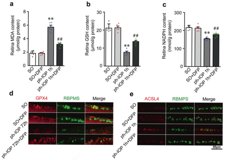 去鐵酮DPF作為鐵螯合劑目前已應(yīng)用于臨床治療鐵超負(fù)荷疾病,阻止患者血清鐵的蓄積。進(jìn)一步研究DFP對(duì)ph-IOP損傷小鼠鐵代謝的影響。體內(nèi)體外結(jié)果顯示,DFP處理可以顯著降低 ph-IOP誘導(dǎo)的視網(wǎng)膜二價(jià)鐵累積;DFP治療可降低ph-IOP損傷后視網(wǎng)膜MDA含量(圖4a),增加GSH和NADPH水平(圖5b, c );此外,在ph-IOP損傷小鼠中,DFP處理恢復(fù)了GPX4水平,并降低了ACSL4水平(圖5d-e)。以上結(jié)果表明,DFP可以改善ph-IOP誘導(dǎo)的視網(wǎng)膜鐵死亡。