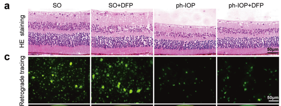 H&E染色結(jié)果顯示,Ph-IOP損傷導(dǎo)致顯著的RGC丟失和視功能損害;接著從形態(tài)學(xué)和功能上驗(yàn)證了DFP對(duì)RGC的藥理作用,在 ph-IOP 損傷后5天,DFP處理減弱了神經(jīng)節(jié)細(xì)胞復(fù)合體(GCC)厚度,并增加了RGC數(shù)量(FG標(biāo)記RGC形態(tài))。這些結(jié)果表明,DFP在ph-IOP損傷后保護(hù) RGC 損傷,因此使用DFP抑制鐵死亡是治療ph-IOP誘導(dǎo)的RGC 損失的有效治療策略。