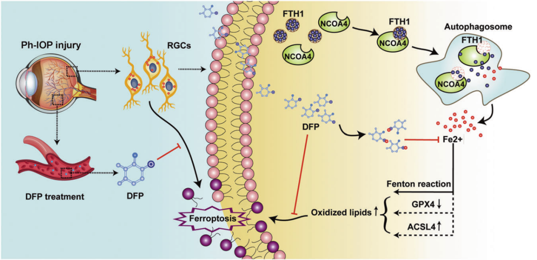 在生理狀態(tài)下,細(xì)胞內(nèi)鐵處于動(dòng)態(tài)平衡狀態(tài),但在病理狀態(tài)下,這種平衡會(huì)被打破。Ph-IOP 損傷可以激活RGC細(xì)胞內(nèi)的NCOA4,激活的NCOA4將結(jié)合FTH1并觸發(fā)溶酶體降解FTH1(稱為鐵自噬)。降解的FTH1會(huì)釋放大量的游離鐵離子,這種具有氧化還原活性的金屬會(huì)進(jìn)一步參與脂質(zhì)過氧化。最終,由鐵引起的脂質(zhì)過氧化氫的積累導(dǎo)致RGC鐵死亡,但口服DFP可以螯合細(xì)胞內(nèi)多余的游離鐵離子,抑制ph-IOP誘導(dǎo)的RGC鐵死亡。