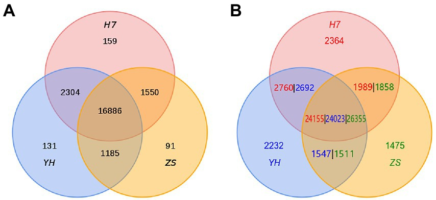 該研究以林果所自主選育的特色板栗良種 ‘燕紅’?(YH,易修剪品種)、‘燕山早生’(ZS,早熟品種) 和‘黑山寨7號(hào)’(H7,耐旱品種)為試驗(yàn)材料,基于納米孔測(cè)序技術(shù)(Nanopore)、Illumina HiSeq X和Hi-C技術(shù),獲得了三個(gè)高質(zhì)量染色體水平的板栗基因組。通過(guò)同源基因鑒定和基因家族聚類分析,發(fā)現(xiàn)H7、YH和ZS分別有159、131和91個(gè)特有的基因家族。通過(guò)全基因組比對(duì)分析,尋找三個(gè)樣本基因組間的存在/缺失變異(PAV)信息,發(fā)現(xiàn)H7、YH和ZS中分別存在2364、2232和1475個(gè)特有基因(見(jiàn)圖1)。