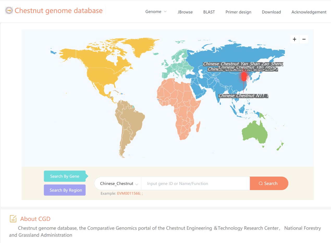 此外,依托國(guó)家林草局板栗工程中心,構(gòu)建了板栗基因組數(shù)據(jù)庫(kù)(圖三),為瀏覽基因組(JBrowse)、搜索序列(BLAST)和設(shè)計(jì)引物提供了工具。