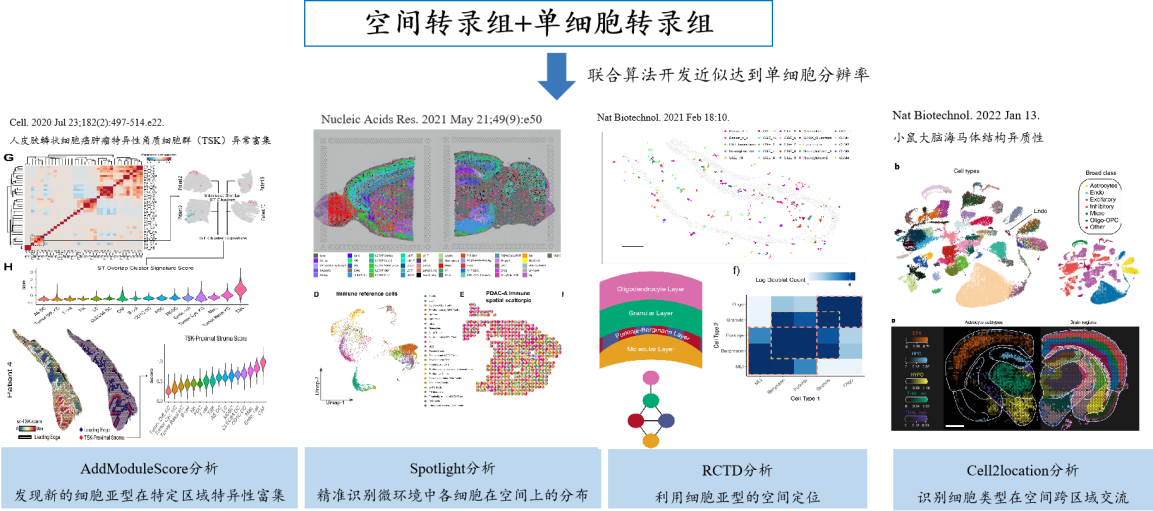 基因表達具有時間和空間特異性,單細胞轉(zhuǎn)錄組主要從時間上研究基因表達,能夠系統(tǒng)的識別組織中的細胞亞群,但沒有捕獲其空間組織信息,限制了我們對組織及細胞間相互作用的理解。而空間轉(zhuǎn)錄組的應(yīng)用使得人們能夠從空間的角度解析數(shù)據(jù),在空間上研究基因的表達。通過整合兩種數(shù)據(jù)模式,將單細胞轉(zhuǎn)錄組數(shù)據(jù)和空間轉(zhuǎn)錄組數(shù)據(jù)進行聯(lián)合分析,在時空上分析基因的表達具有重要的意義。