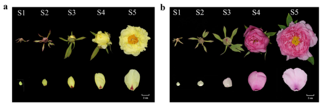 為表征樹牡丹花色發(fā)育情況,以黃花品種“海黃”和紫紅花品種“肉芙蓉”為研究對(duì)象,在花蕾早期至盛開的S1-S5共5個(gè)發(fā)育階段對(duì)兩個(gè)品種的花瓣組織進(jìn)行了取樣,用于測定花瓣顏色指數(shù),在“海黃”中發(fā)現(xiàn)L *(明度)值從S1到S5逐漸增加,這表示花瓣顏色明度升高。C *(色度)和b *(黃色)在S3達(dá)到峰值,隨后在S4和S5下降,證明S3是顏色最黃的階段。而“肉芙蓉”在整個(gè)開花過程中沒有觀察到L *的顯著變化。在S1到S5階段,“肉芙蓉”中b *顯著低于“海黃”。同樣,“肉芙蓉”中a *(紅色)比“海黃”要高得多。