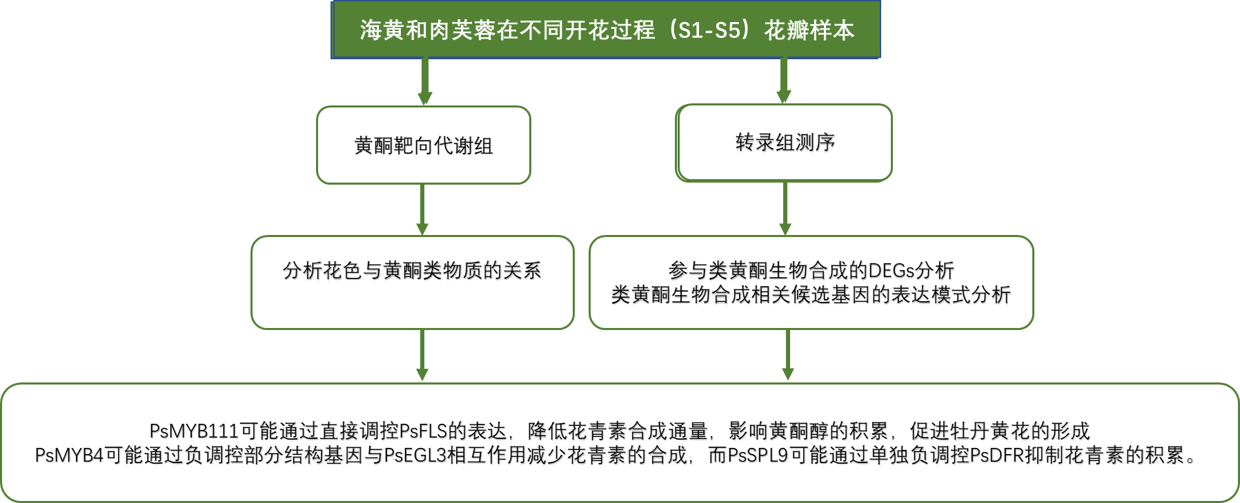 TF分析顯示調(diào)節(jié)黃酮類生物合成的TF基因都在具有黃色花的“海黃”品種中上調(diào),MYB和bHLH是調(diào)節(jié)植物黃酮類生物合成的關(guān)鍵轉(zhuǎn)錄因子TFs。該研究鑒定了幾個(gè)差異表達(dá)的MYB和bHLH轉(zhuǎn)錄因子,每一個(gè)都與牡丹黃酮類的產(chǎn)生有關(guān)。其中,PsMYB4被鑒定為具有bHLH相互作用位點(diǎn)的負(fù)黃酮類調(diào)節(jié)劑,這意味著它們可能形成一個(gè)復(fù)雜的負(fù)調(diào)控網(wǎng)絡(luò)。研究發(fā)現(xiàn)PsMYB111通過單獨(dú)調(diào)節(jié)PsFLS促進(jìn)黃酮醇的積累。此外,PsMYB4和PsEGL3可能形成復(fù)合物負(fù)調(diào)控部分結(jié)構(gòu)基因,而PsSPL9可能單獨(dú)負(fù)調(diào)控PsDFR,抑制花青素的產(chǎn)生,降低藍(lán)色著色。