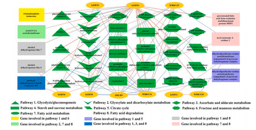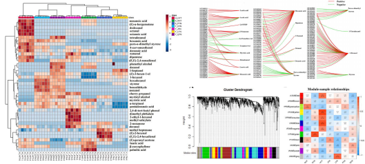 該研究對(duì)中國7個(gè)地區(qū)突尼斯石榴的代謝組和轉(zhuǎn)錄組、風(fēng)味相關(guān)屬性和揮發(fā)性化合物進(jìn)行了研究。7個(gè)不同種植區(qū)的石榴,糖、有機(jī)酸和維生素c含量存在顯著差異。所有樣品共鑒定了40種揮發(fā)性化合物,其中13種揮發(fā)性化合物。所有樣品中有4種化合物含量較高,包括1-己醇、(Z)-3-己烯醇、α-松果醇和2,4-二叔丁基苯酚,是影響石榴香氣品質(zhì)的主要貢獻(xiàn)因素。所有樣品的5個(gè)差異積累代謝物,包括棕櫚酸、辛酸、月桂酸、癸酸和肉豆蔻酸,在所有樣品的脂肪酸生物合成中均顯著富集。WGCNA分析結(jié)果表明42個(gè)候選風(fēng)味相關(guān)差異表達(dá)基因和9個(gè)轉(zhuǎn)錄因子主要位于3個(gè)關(guān)鍵模塊中。己烷酸是一種重要的代謝物,與38個(gè)差異表達(dá)基因顯著相關(guān)。本研究構(gòu)建了復(fù)雜的調(diào)控網(wǎng)絡(luò),以確定調(diào)控石榴中揮發(fā)性化合物代謝的結(jié)構(gòu)基因和轉(zhuǎn)錄因子,發(fā)現(xiàn)bZIP56、bZIP56、bZIP20、WRKY24和bHLH9在石榴果皮的風(fēng)味代謝調(diào)控中起重要作用。