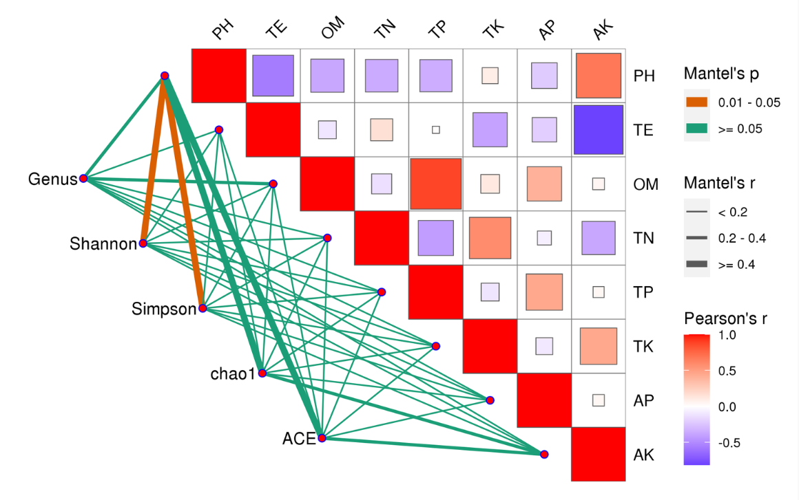 Mantel Test分析:Mantel test 是檢驗兩個矩陣相關(guān)關(guān)系的非參數(shù)統(tǒng)計方法,多用在生態(tài)學(xué)上,用來檢驗群落距離矩陣(如 Bray-Curtis distance matrix)和環(huán)境變量距離矩陣(即環(huán)境因子指標(biāo))之間的相關(guān)性。其可以得到特征與環(huán)境因子之間的mantel test的r值和p值。