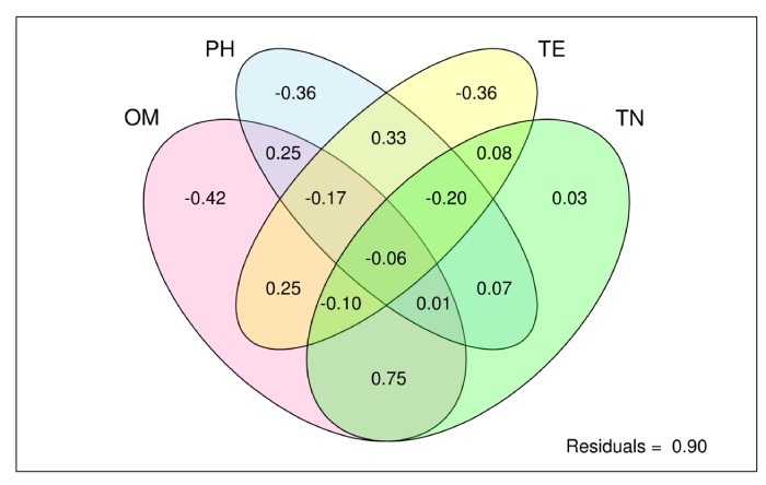 VPA分析(方差分解分析):VPA,全稱Variance Partitioning Analysis,中文稱為方差分解分析,該分析的目的是確定指定的環(huán)境因子對群落結(jié)構(gòu)變化的解釋比例。通常在CCA/RDA的排序分析方法可以得到所有參與分析的環(huán)境因子對群落變化的解釋比例。使用R語言vegan包(version:2.3-0),varpart函數(shù)進行分析;分析前首先需要對環(huán)境因子進行一個分類,一般支持2-4類,默認使用大于等于2個環(huán)境因子進行此分析。