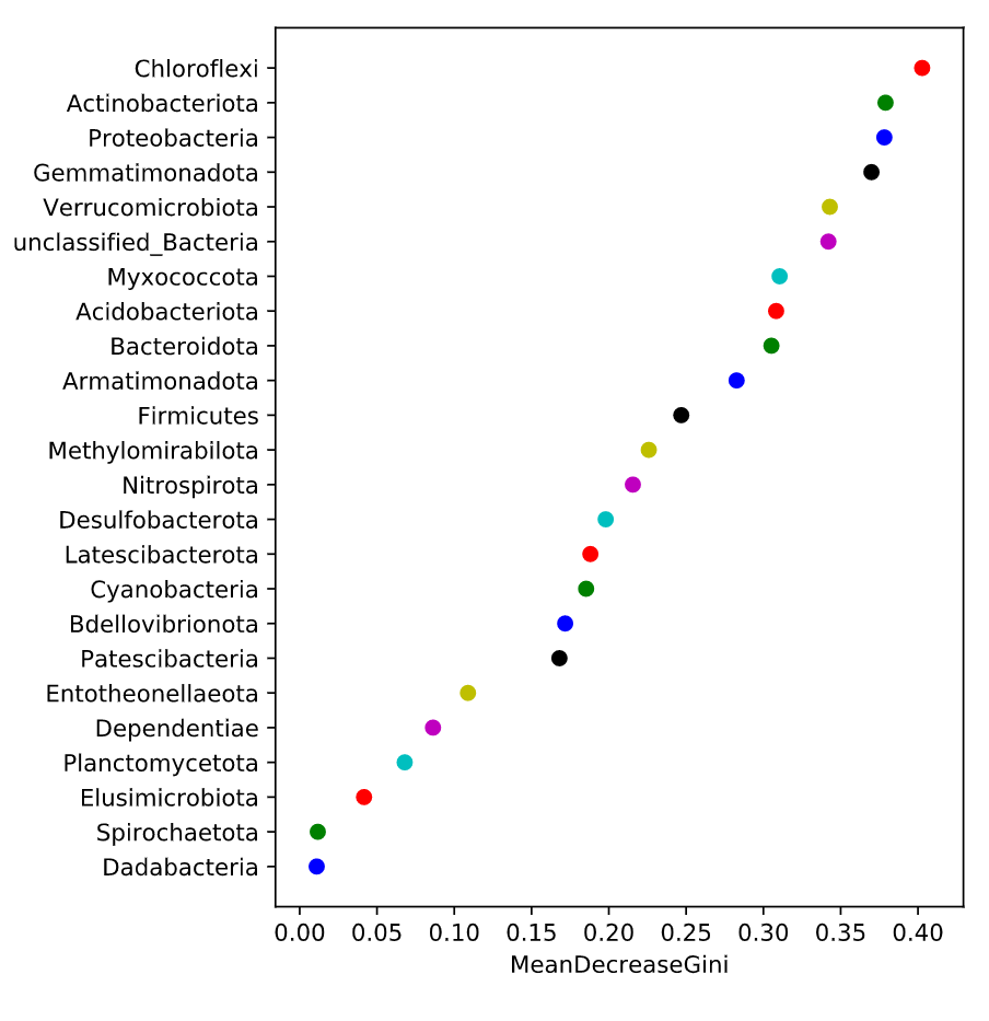 隨機森林分析:Random forest 分析,隨機森林指的是利用多棵樹對樣本進行訓(xùn)練并預(yù)測的一種分類器,是機器學(xué)習(xí)的一種。利用隨機森林分析可以幫我們找到數(shù)據(jù)中重要的特征:在微生物組中就是哪些微生物組成可以作為特征進行各種預(yù)測;另外,隨機森林可以利用這些重要特征構(gòu)建模型用于分類預(yù)測(分類變量)或者回歸預(yù)測(數(shù)值型變量);隨機森林分析建議分組內(nèi)樣品至少30個以上,樣品數(shù)太少影響準確性。 隨機森林分析,一般將數(shù)據(jù)劃分為訓(xùn)練數(shù)據(jù)集(train data)和測試數(shù)據(jù)集(test or validate data),訓(xùn)練數(shù)據(jù)集用于構(gòu)建預(yù)測模型,測試集用于查看模型的準確性。