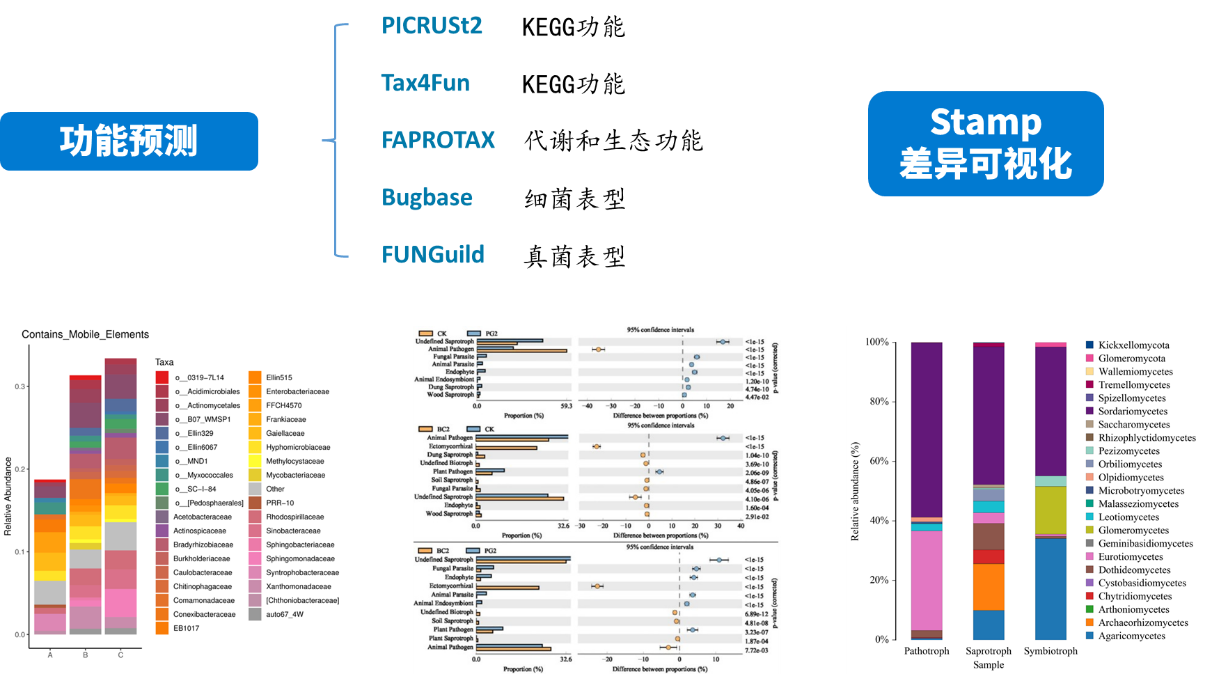 PICRUSt 2 將特征序列(16S rRNA)與微生物基因組數(shù)據(jù)庫(IMG,Integrated Microbial Genomes)參考序列對齊(aliign)構(gòu)建進化樹,找到特征序列的“最近物種”,并根據(jù)已知物種的基因種類和豐度信息預(yù)測未知物種的基因信息,從而結(jié)合基因的KEGG通路信息預(yù)測整個群落的通路情況。通過組間差異分析,得到在組間具有顯著差異的功能,最后利用Stamp對結(jié)果進行差異可視化。