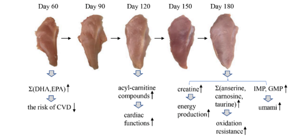 隨著日齡的增長,十五烷酸、硬脂酸、肌酸、肌肽、IMP、L-組氨酸和賴亮氨酸呈上升趨勢,而鵝氨酸、DHA、天冬氨酸、LPA 18:1和 LPI 18:1隨著日齡的增長而下降。
