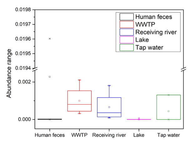 此外,人類(lèi)糞便樣本中ARGs豐度與 crAssphage豐度之間沒(méi)有相關(guān)性,證實(shí)了腸道里 ARGs 豐度與crAssphage 豐度無(wú)關(guān)。這對(duì) crAssphage作為人類(lèi)糞便污染的指示基因至關(guān)重要。因此,上述環(huán)境樣本中ARGs 與 crAssphage 豐度之間的顯著正相關(guān)表明供試受納水體中 ARGs 的富集在很大程度上可歸因于人類(lèi)糞便污染。