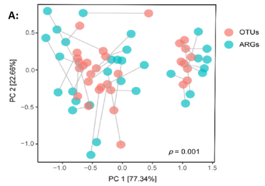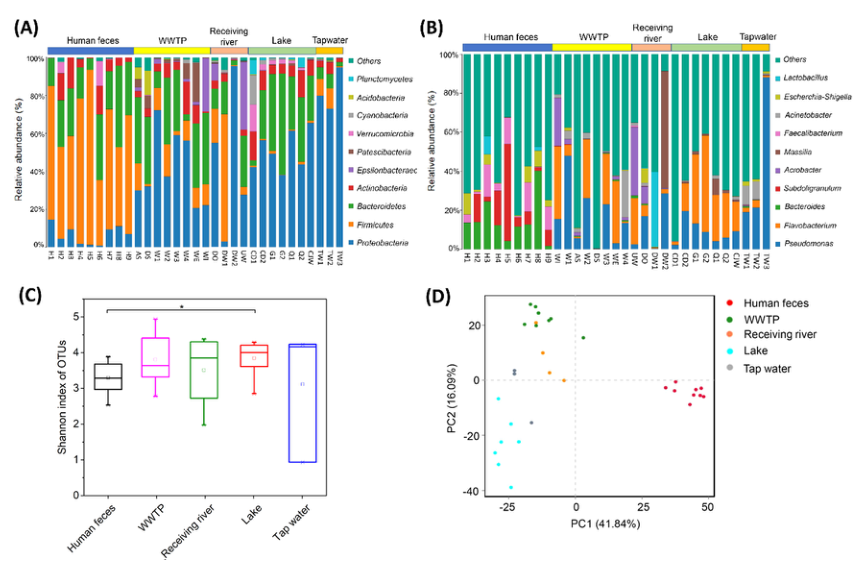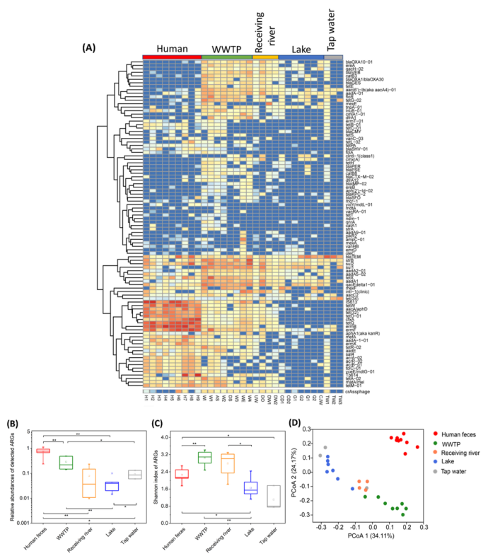 ARG多樣性也隨著水從污水處理廠向自來(lái)水的輸送而減少(1C)。所有樣本的ARG譜的PCoA表明,不同類(lèi)型的樣本包含顯著不同的ARG成分。從環(huán)境樣品中分離出人類(lèi)糞便中的ARGs(圖1D),表明腸道具有獨(dú)特的ARG圖譜。這可能是因?yàn)榕c環(huán)境相比,腸道的條件不同。來(lái)自污水處理廠和受納河水的樣品聚在一起較近,證實(shí)了污水處理廠出水的排放對(duì)受納河中的ARGs有很大影響。同樣,湖泊和自來(lái)水更傾向于聚集在一起,與所研究的湖泊都是自來(lái)水水源一致。上述結(jié)果表明,在所研究的樣品中普遍存在ARGs,污水處理廠攜帶的ARGs可能污染不同的受納水體。