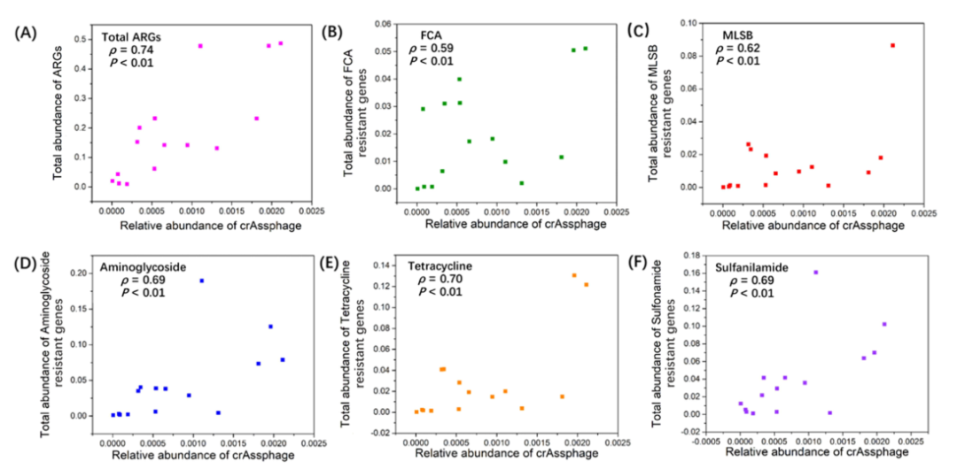 圖3.按目標(biāo)抗生素分類(lèi)的ARGs總豐度與水樣中crAssphage豐度之間的相關(guān)性