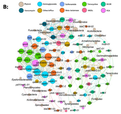 在該研究中,84個(gè)ARGs、5個(gè)MGES和20個(gè)細(xì)菌門(mén)被用來(lái)進(jìn)行網(wǎng)絡(luò)分析(圖6B)。Chlamydiae和Dependentiae 與11種不同的ARG顯著相關(guān),表明它們的基因組中可能含有多種ARG類(lèi)型。四環(huán)素耐藥基因、大環(huán)內(nèi)酯類(lèi)耐藥基因ermB和氨基糖苷類(lèi)耐藥基因aacA/aphD是四環(huán)素耐藥基因的潛在宿主。Elusimmicrobia可能是aadE、blaCTX-M-02、Olec和vanRA-01的宿主。Synergistetes 可能是tetW、IS613和catA1的潛在宿主。由于該網(wǎng)絡(luò)是建立在相關(guān)性的基礎(chǔ)上,觀察到的ARGs潛在細(xì)菌宿主仍需進(jìn)一步的試驗(yàn)驗(yàn)證。